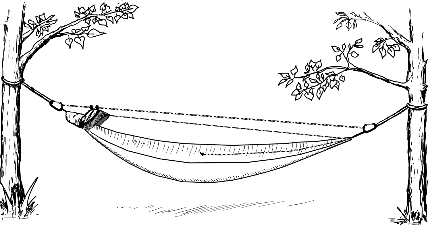 In jedem Moment kann man das Moskitonetz zurückziehen und ein Fenster zwischen der Abdachung und der Hängematte bilden, um sich umzuschauen, nach etwas zu greifen oder einfach mit Bekannten zu sprechen. Indem man einen Schieber am Ende der Hängematte sperrt kann man das Moskitonetz direkt über dem Kopf aushangen und z.B. Sterne bewundern. Das übrige Teil des Körpers bedeckt den Hängemattenstoff und bildet einen charakteristischen und sicheren Kokon. Der Schieber verbindet die Kanten der Hangematte durch 2/3 ihrer Lange, von Füßen in die Richtung des Kopfs.
