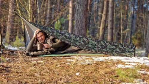 Der HIDEOUT THERMO camo kann auch als Tarp verwendet werden.