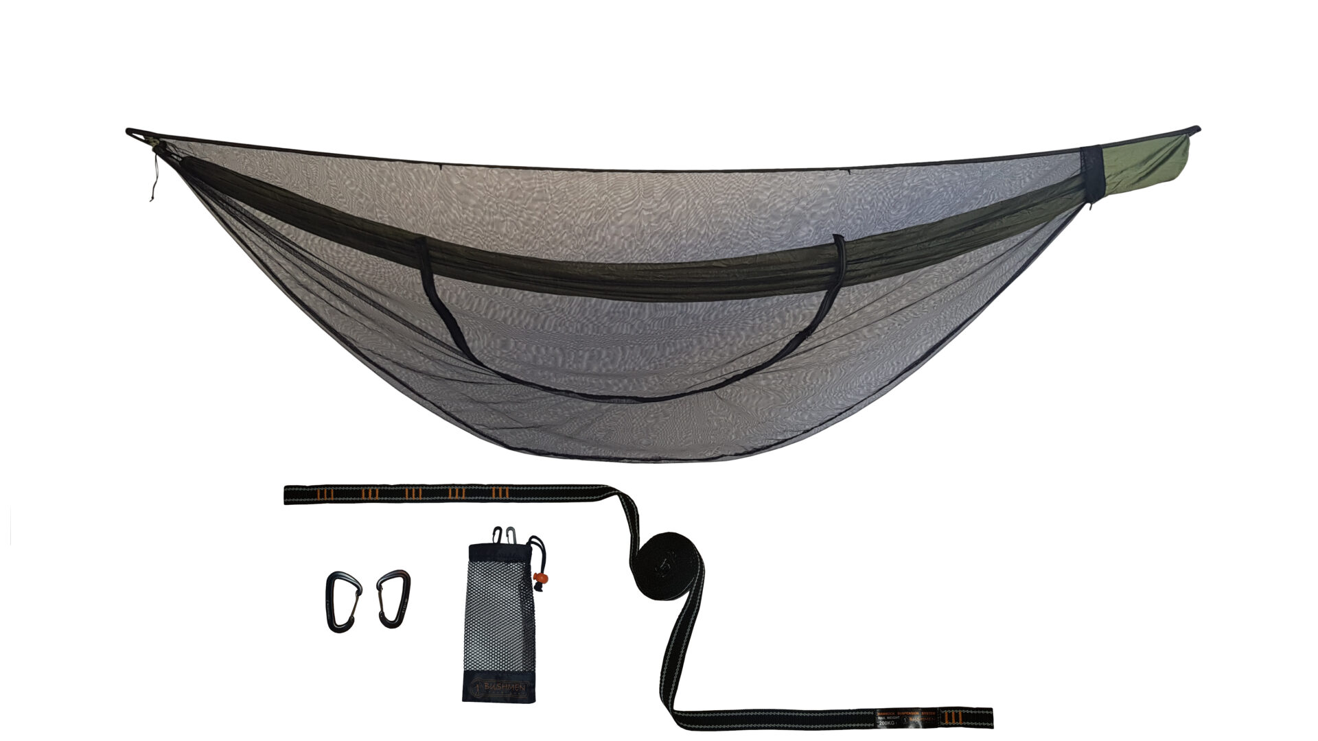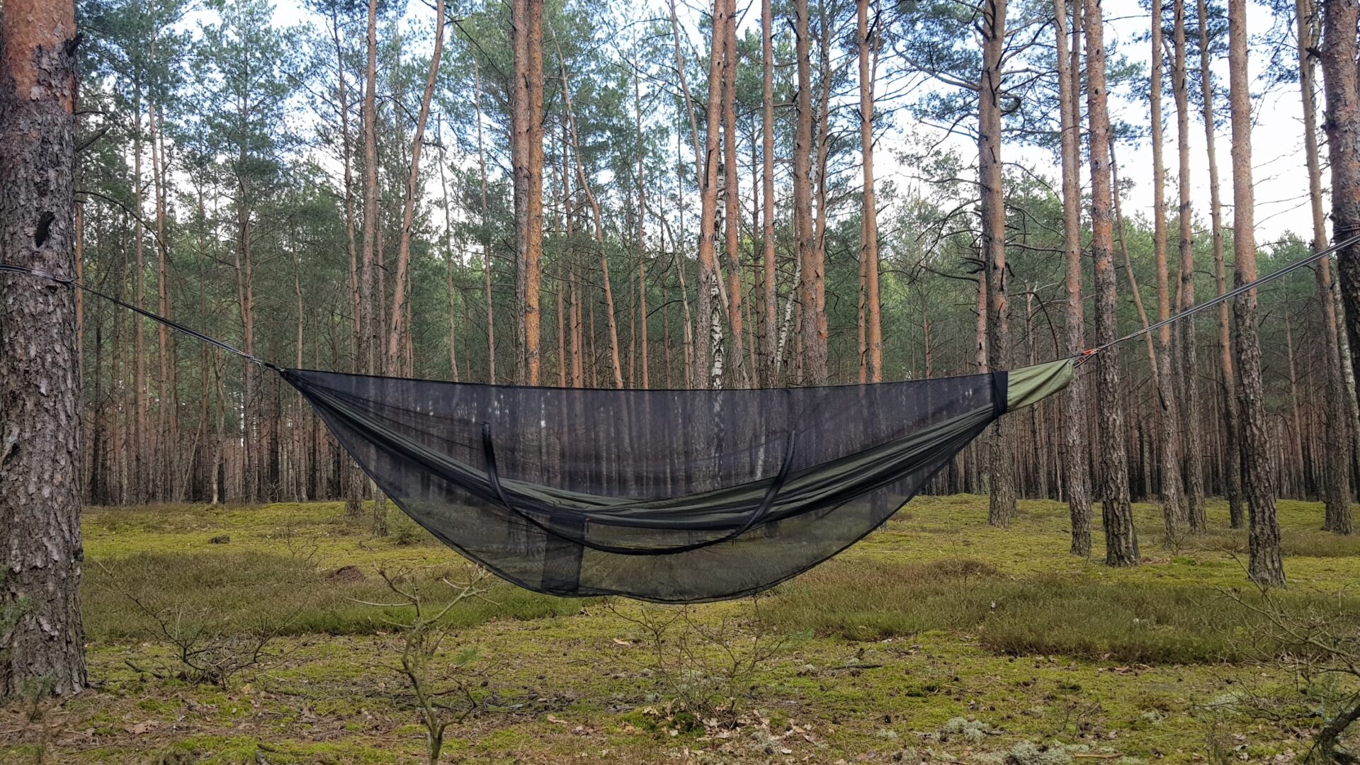 Die Hängematte in klassischem Oliv passt makellos zu dem schwarzen Moskitonetz, und das ganze Set harmoniert perfekt mit der natürlichen Umgebung. Die orangefarbenen Details unterstreichen das Bushcraft-Flair noch.:)