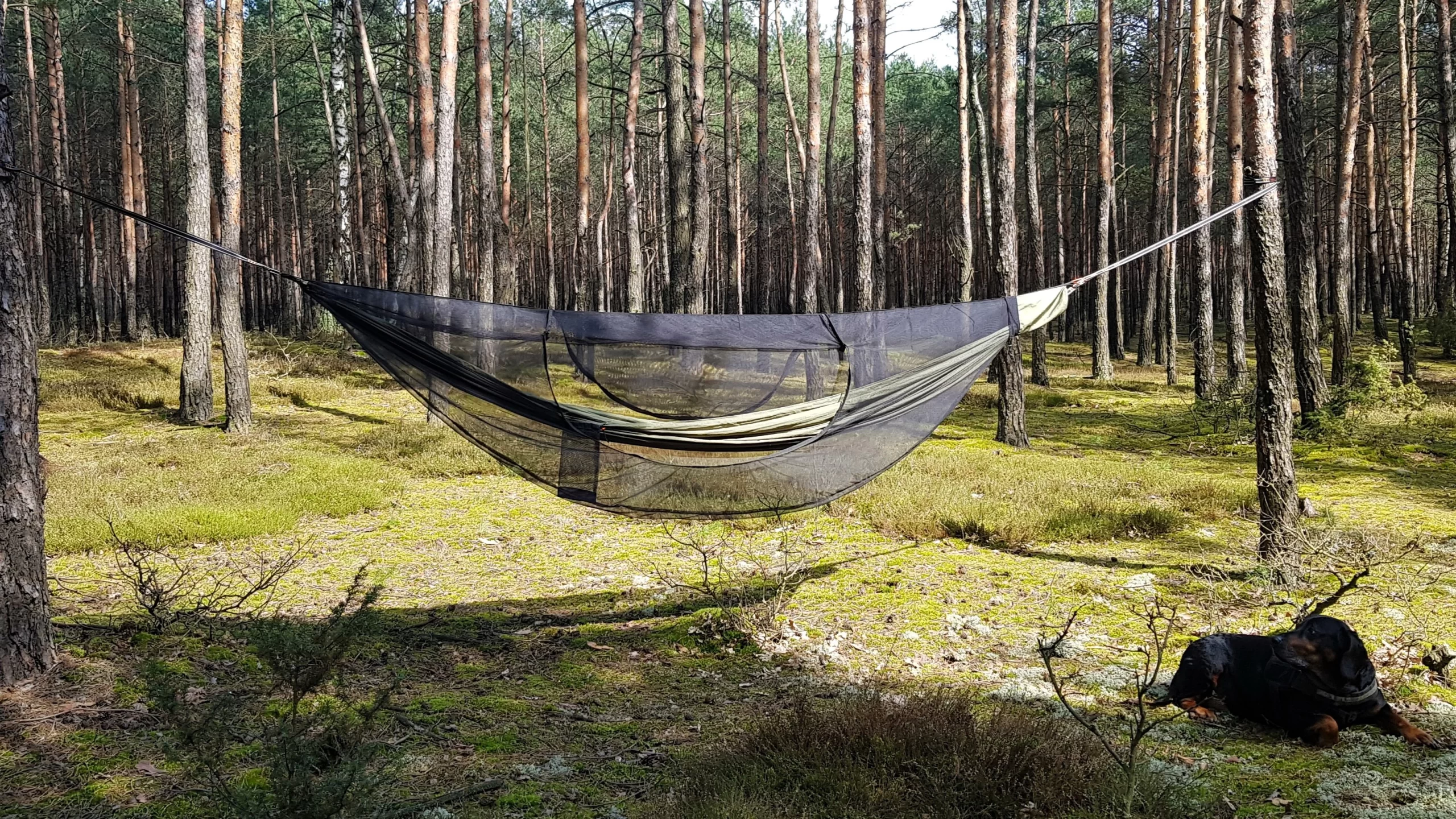 Die Hängematte in klassischem Oliv passt makellos zu dem schwarzen Moskitonetz, und das ganze Set harmoniert perfekt mit der natürlichen Umgebung. Die orangefarbenen Details unterstreichen das Bushcraft-Flair noch.:)