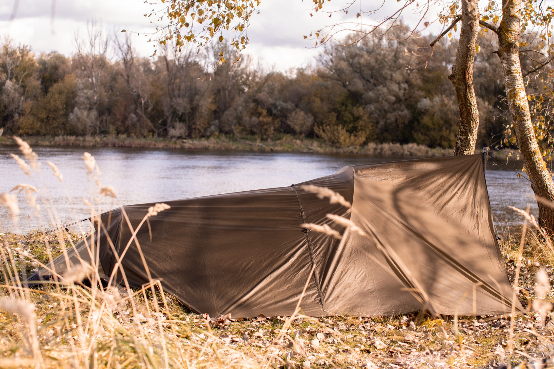 You can also raise the half tarp, lean on trekking poles, paddles, bicycles or simply branches and enrich your bedroom with a roof covered patio.