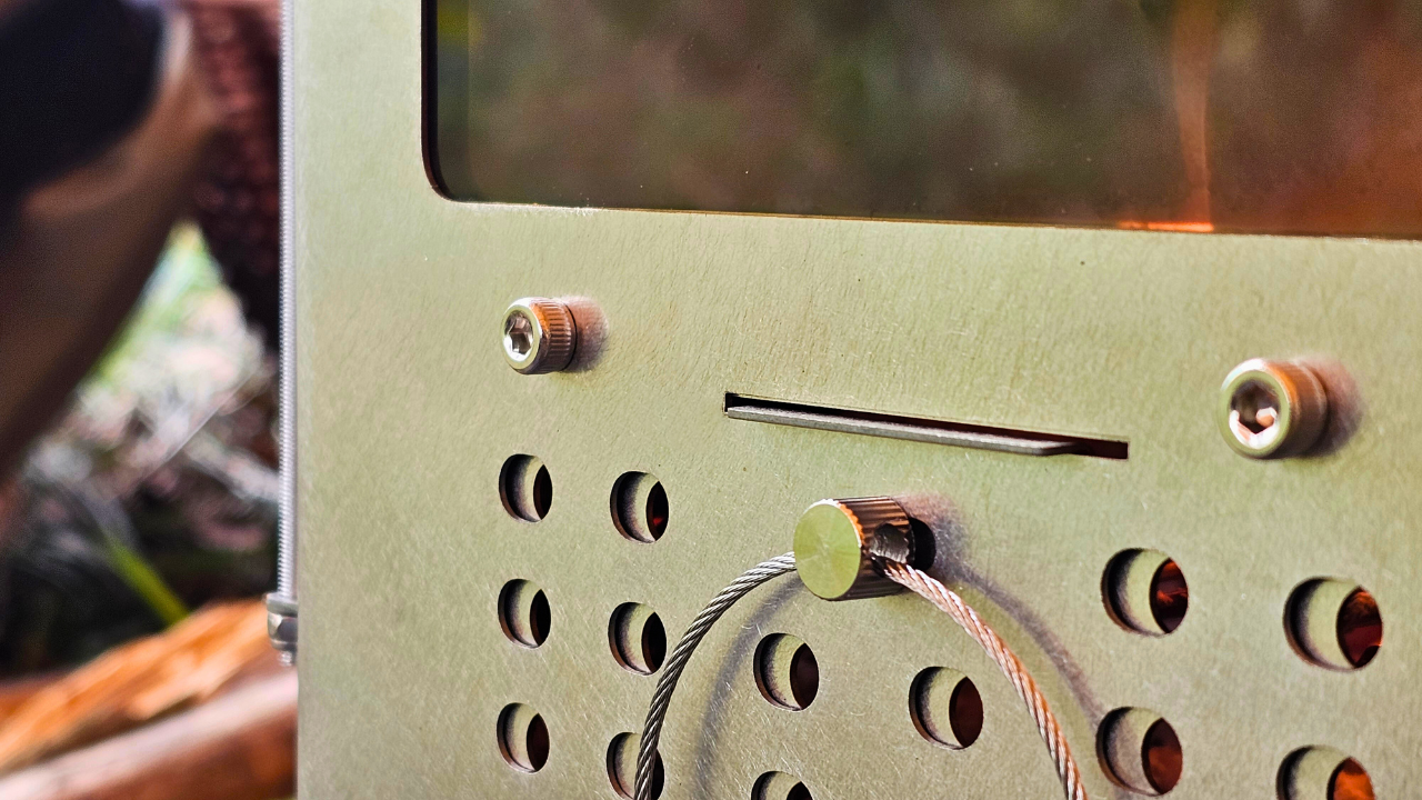 With a combustion chamber 30.5 cm long, the FASTFOLD S2WT Titanium is designed primarily for use with kindling, making it an eco-friendly solution for lightweight fuel. It features two tempered glass windows: a small one (5×12 cm) on the short side with a door for monitoring the fire, and a larger one (6.5×21 cm) on the longer side, offering a view of the flames. The included grate, along with efficient air intake control and damper, ensures longer and safer heat retention.
