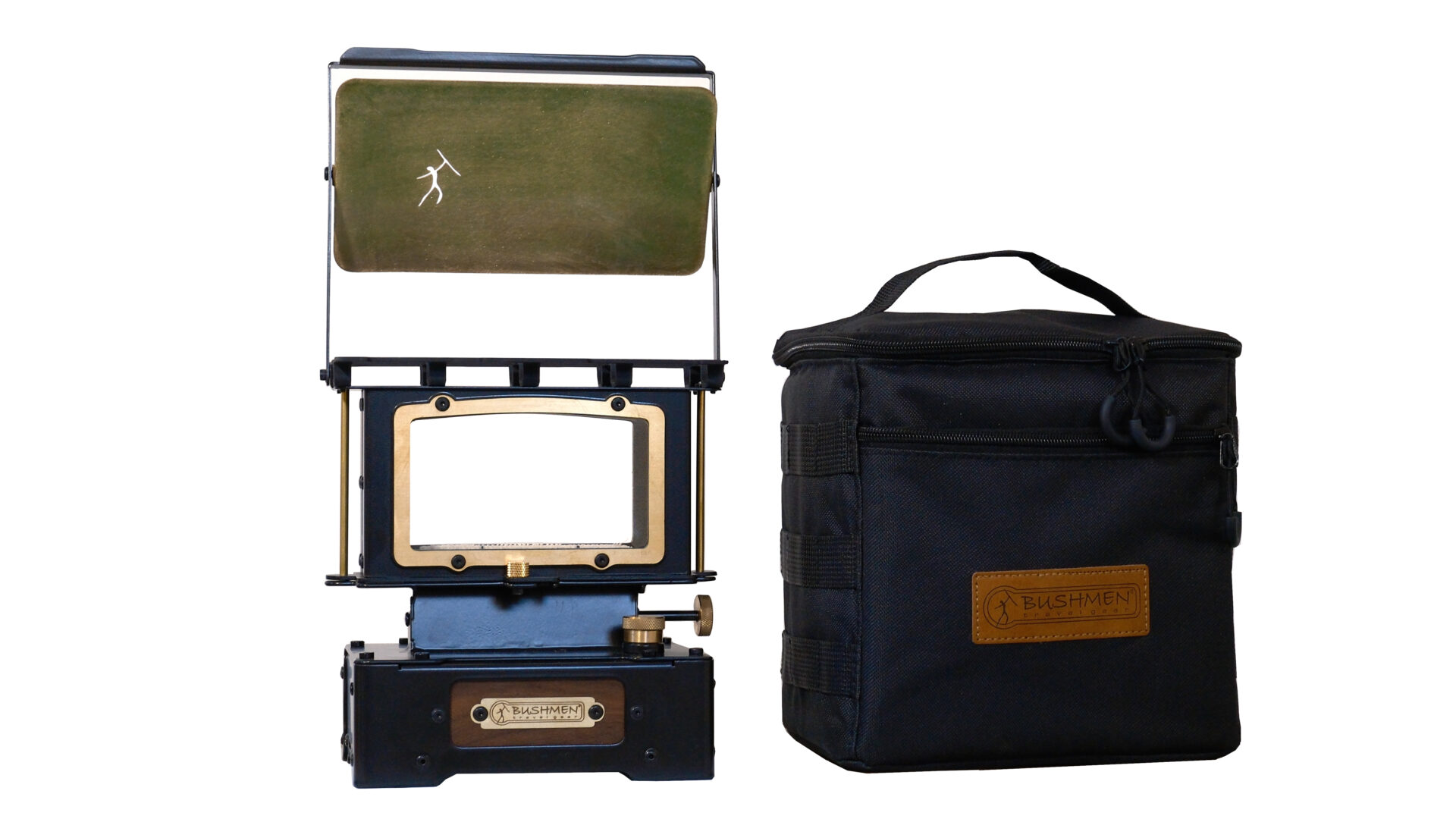 The brass reflector redirects warmth and glow, shielding hands from the flame and the elements’ whims.