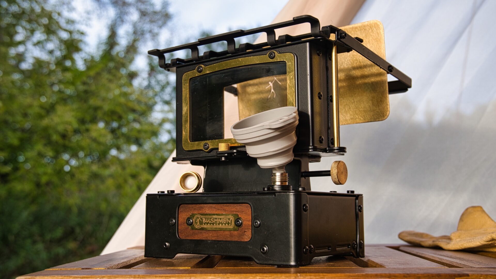 The brass reflector redirects warmth and glow, shielding hands from the flame and the elements’ whims.