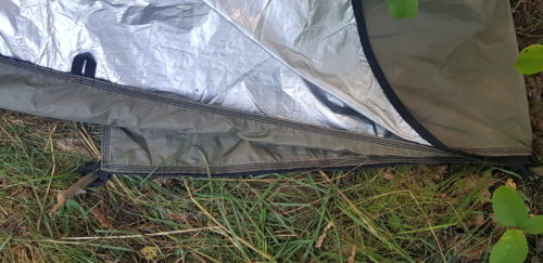 掛け布団になる方のタープがずり落ちないように、ループは最低二箇所を地面に固定するのが好ましいです。睡眠中に窮屈に感じないように頭側のループは開放しておくか、伸縮性のあるコードで固定しておくのがいいでしょう。