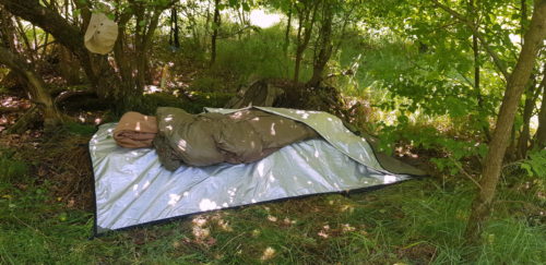 折りたたんだもう半分のタープは、掛け布団(ブランケット)として使用します。寝袋を持っている場合は、寝袋の上にかぶせるようにします。