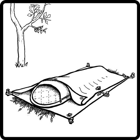 ベッドの設置場所の地面が硬い場合は、周囲から集めた苔や葉っぱを敷いて、地面とタープの間に層を作りましょう。
