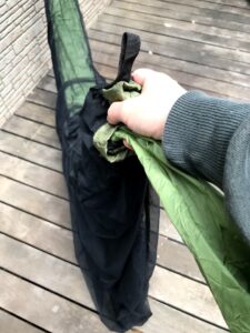 ①モスキートネット収納袋反対側を一気に収納袋まで持って行きます。設営時にはハンモックの収納袋はモスキートネットの反対側にしておきます(モスキートネットをしまう時に非常に邪魔になる為) |