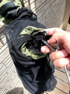 ⑤二重に折り重ねて畳んだ部分にその下に垂れているネットを巻きつけます。その際に腕を畳んだネットの中に入れておいてください。⑥垂れたネットを巻きつけたら腕を抜いてカラビナが見える所まで移動させてください。腕を抜いたスペースがありますのでスムーズに移動出来ると思います。 |