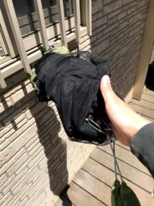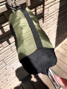 ⑨詰めたら巾着を閉めて完成です。カラビナは外に飛び出した状態で付けておくと次回の設営が楽になります。