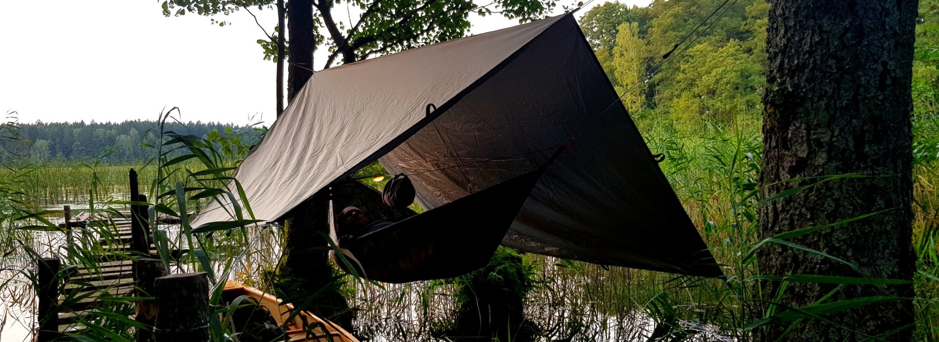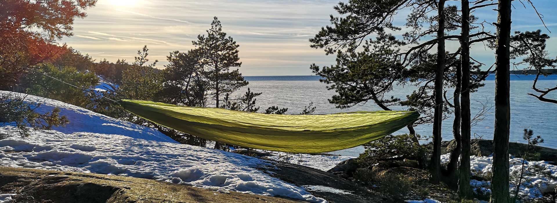 濡れた地面、ゴツゴツした岩場。どんな環境にも適応する野宿のソリューションがハンモックです。木の幹、車、ヨットのマスト、岩の溝など、ハンモックを吊るすポイントを2箇所確保するだけで、快適な寝床の出来上がりです。