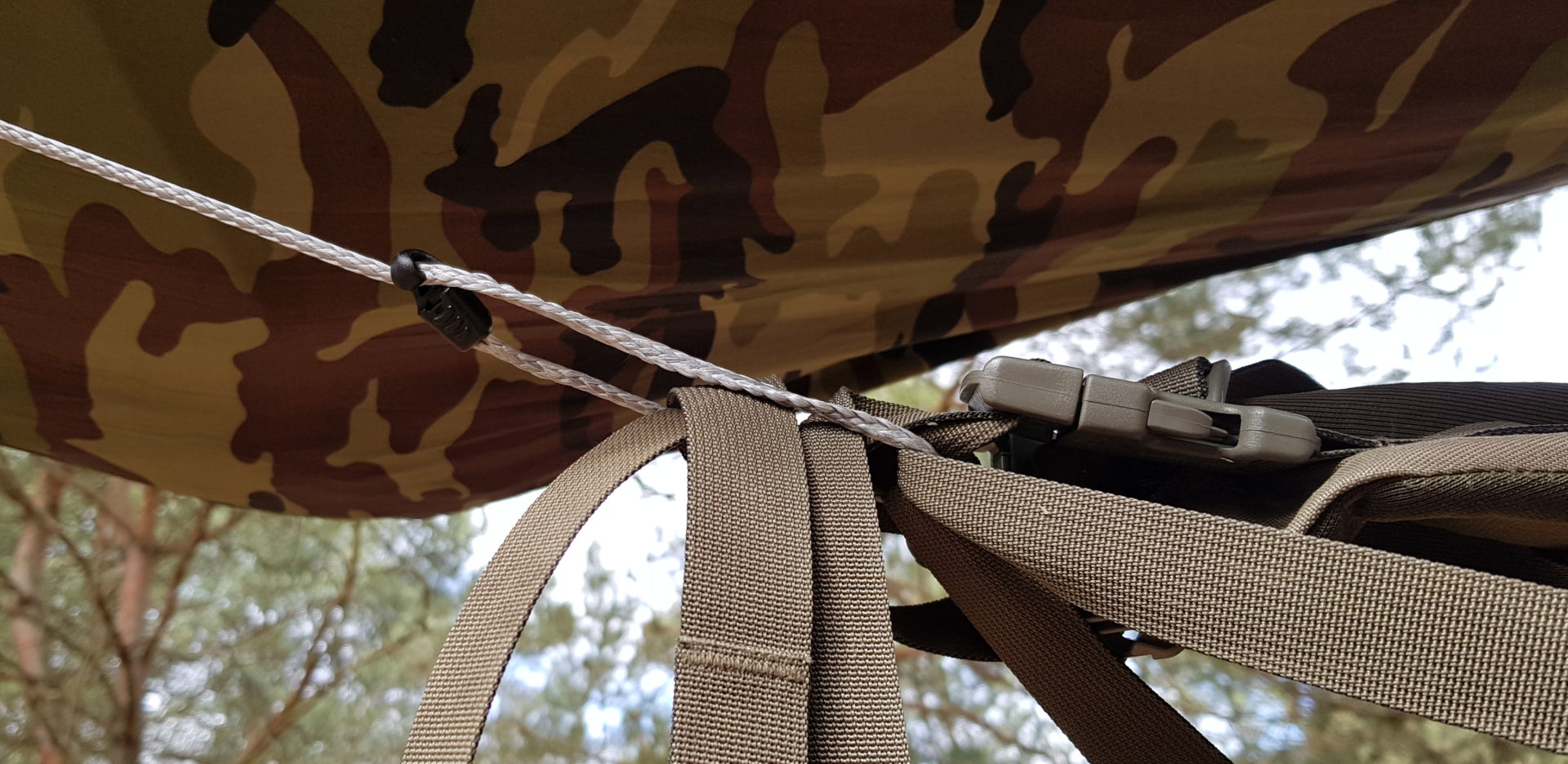 If the free ends are short, we can hook them next to the whoopie cords of the slings. In that way, we are creating two convenient loops where we can hang our luggage. In this way, you can hang-on luggage up to 10 kg.