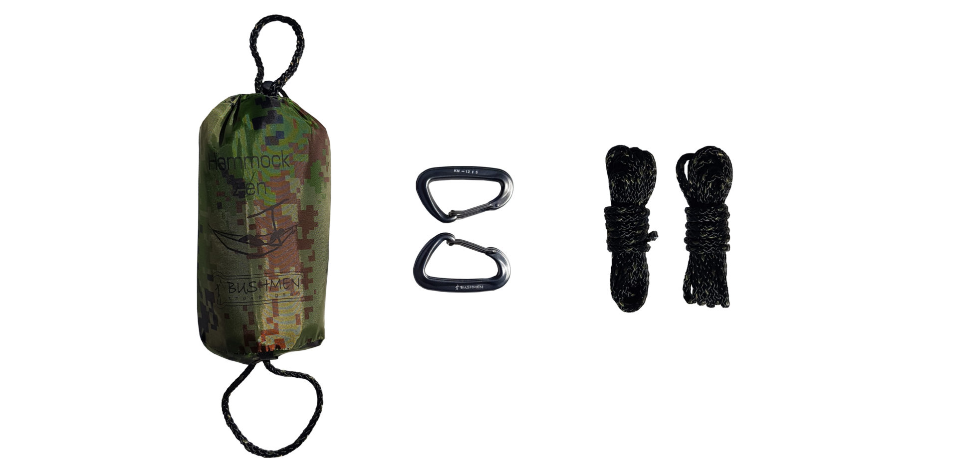 BUSHMENのZEN – Hammock / marpatは、手にした瞬間から使うことができます。セットには、3mの吊り下げ用ロープ (2本) と、超軽量カラビナ(2個)が含まれます。カラビナ1個の重さは21gで、静止荷重は1.2kN (約1200kg) です。