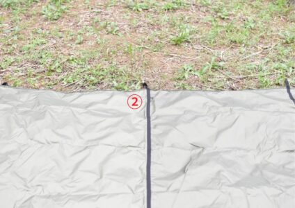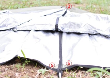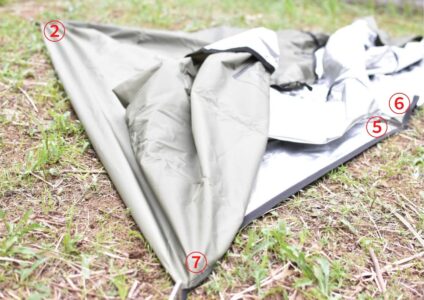 ⑤と⑥を断熱シートが上に来るように①のあたりに持ってきます。その際に②としっかりテンションがかかるように引っ張ってペグダウンします。 |