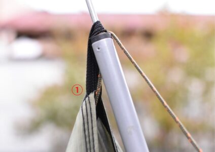 この一連のテンションをかけてのペグダウンが甘いとポールがぐらつくのでしっかりとテンションをかけてください。 |