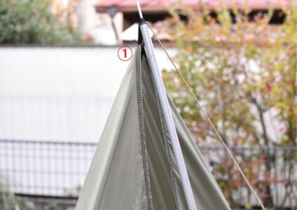 最後にロープを②と①の延長線上にペグダウンすれば完成です。