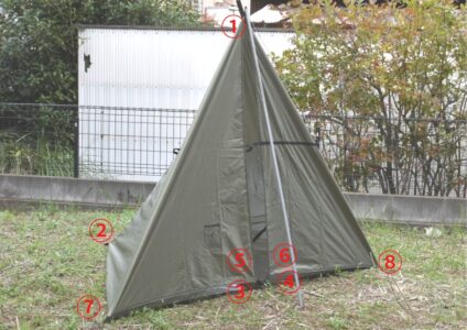 ⑦を持ち、②と⑤との両方のテンションがしっかりとかかるポイントにペグダウンします。反対側の⑧も同様に②と⑥のテンションがしっかりとかかるポイントにペグダウンします。