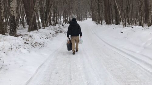 駅から僅か15分ほど走り山の反対側になっただけで気温が一気に下がり、これは積雪10㎝どころではないと思いました。とはいえ風はなく、まだまだ極寒とは言えない静かな雪道を、5分ほど歩き僕らは受付に到着しました。