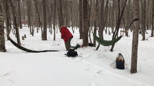 さて、話を極寒雪中ハンモック泊に戻すと、広大な林間内は選び放題張り放題で、中年2人無邪気にはしゃぎながらあーでもないこーでもない言って設営を済ませました。
