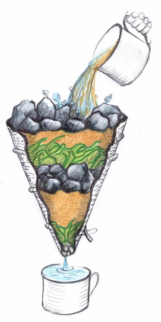 Obwiązując płat kory (np. brzozowej) uzyskujemy lejek (jak na rysunku), który wypełniamy kolejno: kamykami (by nie wypadały wyżej położone warstwy, a zarazem woda miała swobodny odpływ), dalej mchem (lub innym ziołem bogatym w jod, ew. trawą), piaskiem, węglem (aktywnym) z ogniska (czarnym), i ponownie mchem, piaskiem i węglem.