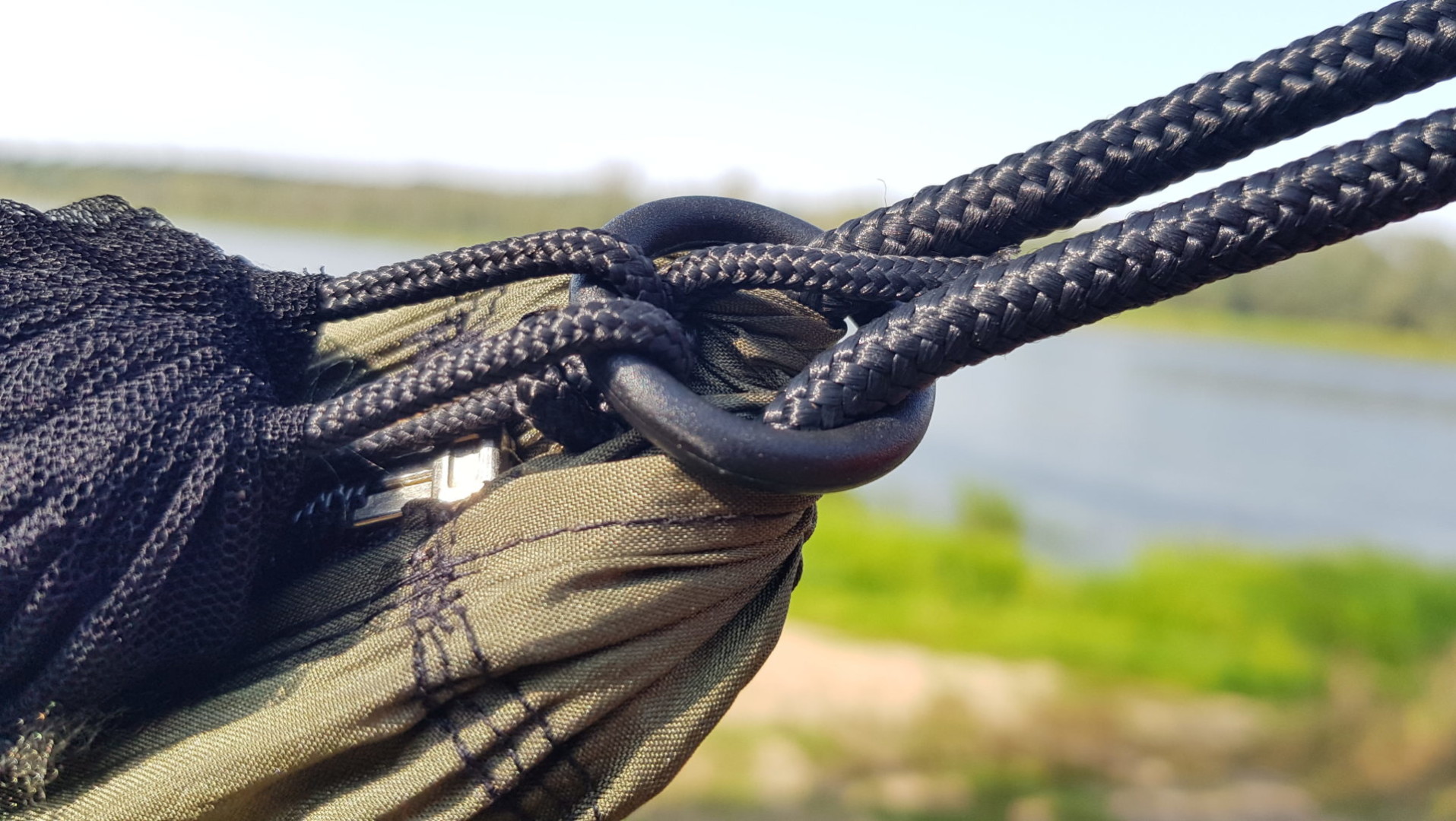 W wyposażeniu znajdują się dodatkowo dwa karabinki ułatwiające montaż oraz 4m linki z przeznaczeniem na cięciwę (ridgeline) do podwieszenia moskitiery.