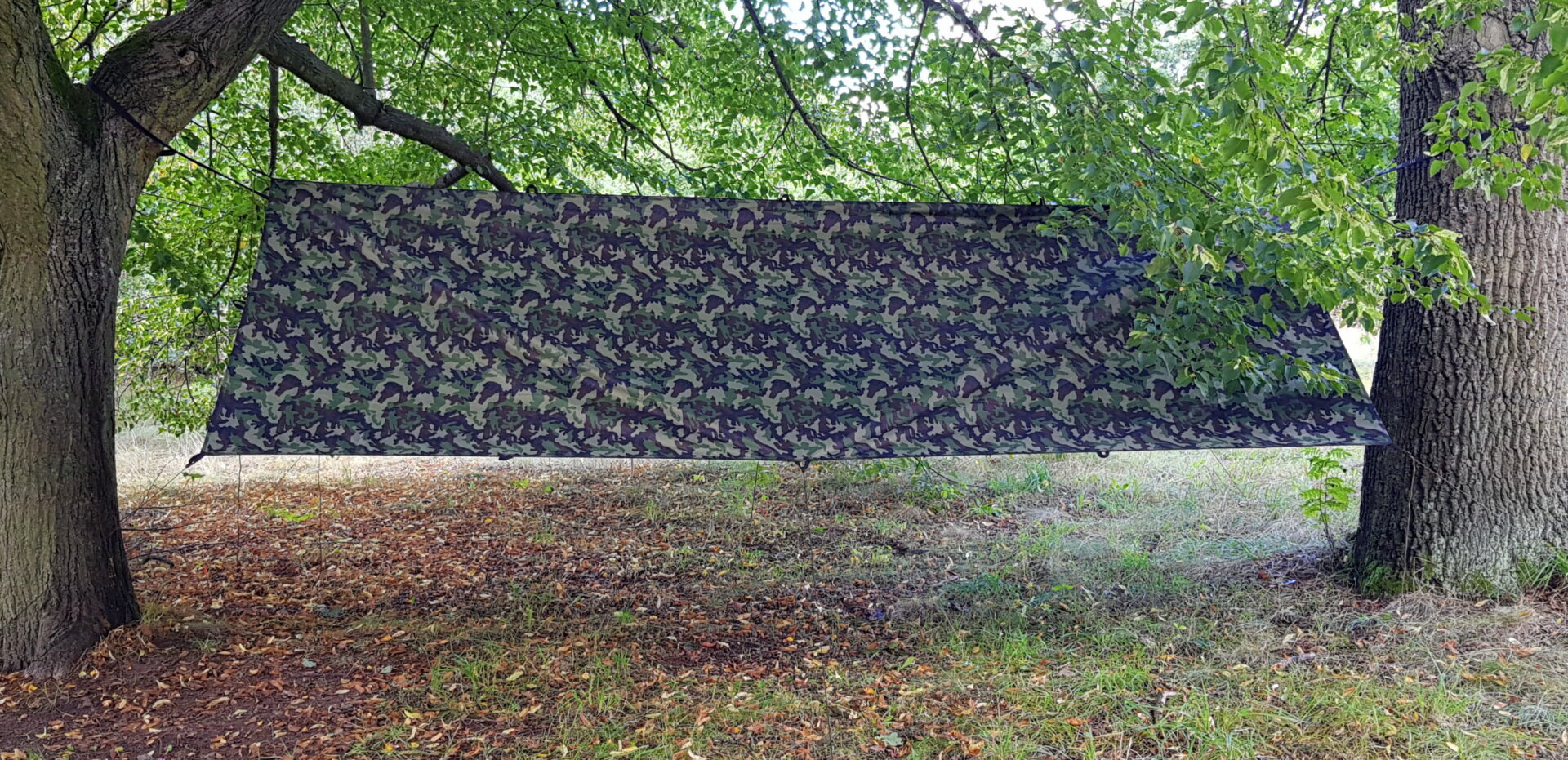 Nieregularne kształty oraz mix kolorów powodują, że tarp zlewa się z leśnym otoczeniem patrząc na niego nawet z niewielkiej odległości.